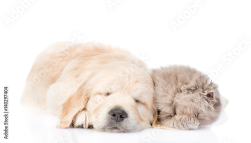 Fototapeta premium Golden retriever puppy sleep with tiny kitten. isolated on white background