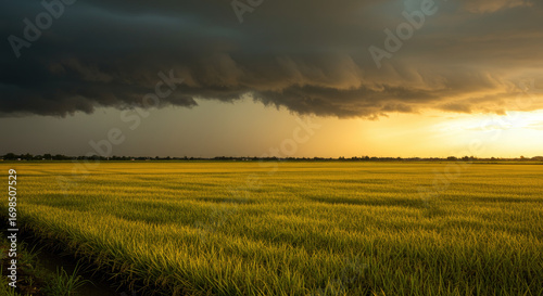 © Alex Dami, Fototapeta premium Golden rice field dramatic stormy sky