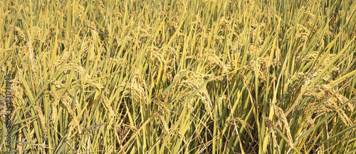 © RomixImage, Naklejka premium Golden rice paddy field landscape swaying over sunset day time.