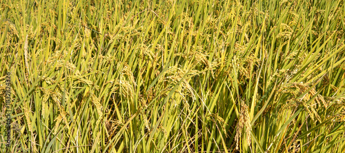© RomixImage, Fototapeta premium Golden rice paddy field landscape swaying over sunset day time.