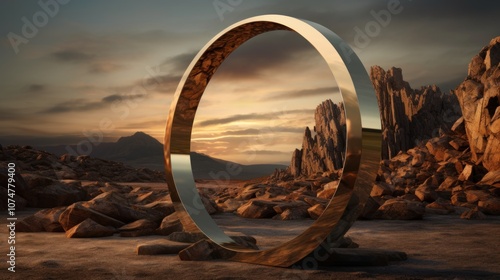 © yasna , Fototapeta premium Golden Ring Sculpture in a Desert Landscape