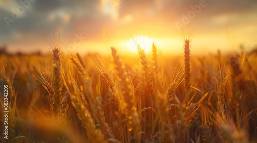 © Berkah, Obraz premium Golden ripe ears of wheat on nature in summer field at sunset rays of sunshine, close-up macro. Ultra wide format.