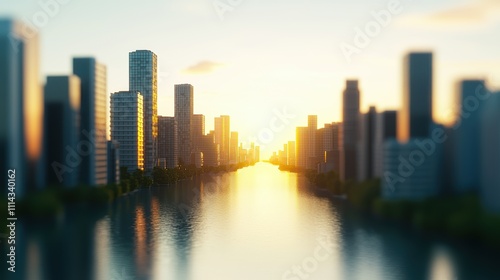 © Sakiyah, Fototapeta premium Golden River Flowing Through Futuristic Cityscape at Sunrise with Reflective Water Surface