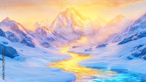 Obraz premium golden river, snowy mountains, winter sunset - dreamy/surreal lands.