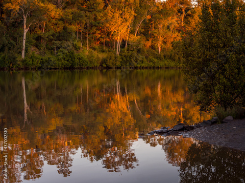 © Kevin, Fototapeta premium Golden Riverside Afternoon with Tree Reflections