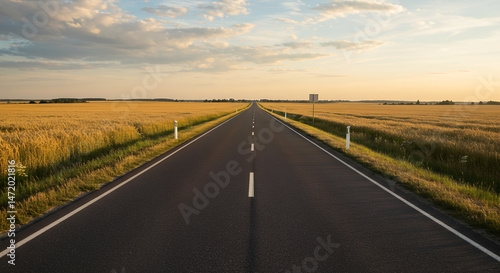 © Aekion, Fototapeta premium Golden Road: Scenic Drive Through Wheat Fields at Sunset - Serene Countryside Landscape