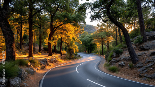 © regulator, Fototapeta premium Golden road winds through lush forest