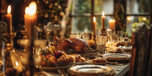 © MNStudio, Fototapeta premium Golden roasted turkey with herb garnish and grapes on platter amid candles on festive table. Traditional Christmas dinner centerpiece, warm holiday feast abundance vibe.
