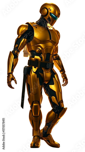 Fototapeta premium Golden robotic figure stands in confident pose on a transparent background