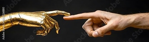© Mutiara, Fototapeta premium Golden robotic hand and human hand touching fingertips in close up