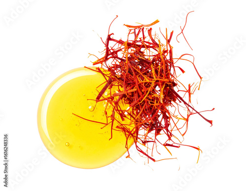 © Easy, Naklejka premium Golden Saffron Threads Infused in Rich Oil Creating Luxurious Aroma and Flavor for Gourmet Use