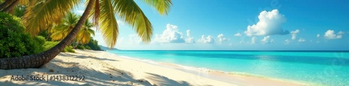 Obraz premium Golden sand, palm fronds sway gently in breeze, azure sea, shore, image, idyllic