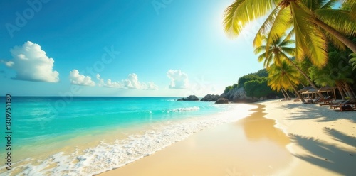 © Rachanon, Fototapeta premium Golden sand, turquoise waves, bright sun, palm trees, background, sunset, paradise