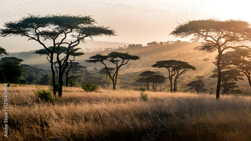 Fototapeta premium Golden Savanna at Dusk with Acacia Trees, Warm Sunset Light, and Distant...