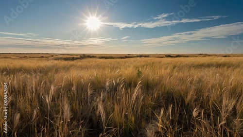 © sitifatimah, Fototapeta premium Golden savannah stretches under a sunny sky with scattered clouds