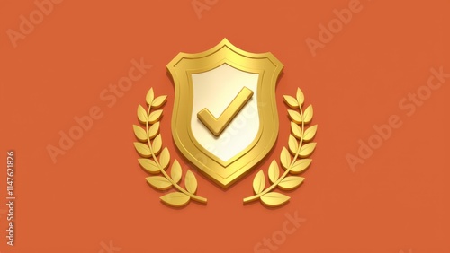 Obraz premium Golden Shield with Checkmark Emblematic of Safety Certification, Surrounded by Laurel Branches on a Solid Background