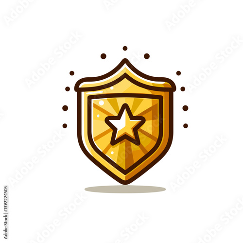 Obraz premium Golden shield with star emblem and sparkles. Ideal for security logos, protection service branding, award badges, or game achievement icon design.