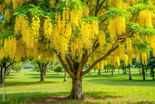 Fototapeta premium Golden Shower Tree in a Lush Green Park, Cascading Blossoms Adorn the...