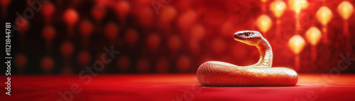 Fototapeta premium golden snake coiled on red surface, illuminated by warm lights, creates...