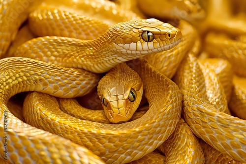 © andyaziz6, Obraz premium Golden Snake Coiled with Intricate Scales and a Focused Gaze