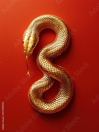 Fototapeta premium Golden snake elegantly coiled on a vivid red background, displaying intricate...
