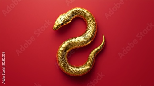 © SakdaSong, Fototapeta premium Golden Snake Illustration with Baroque-Inspired Elegant Poster Layout and Minimalistic Red Backdrop with Glowing Accents