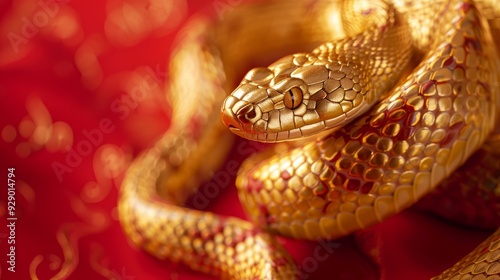 © FryArt, Fototapeta premium Golden snake resting on a vibrant red surface during bright daylight