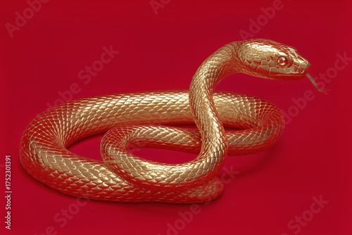 © olegganko, Fototapeta premium Golden Snake Sculpture on a Vibrant Red Background Showing Intricate Details of Scales and Form