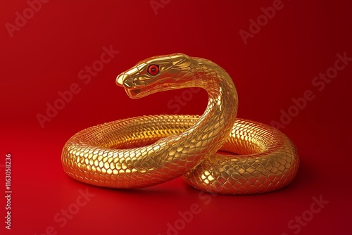 © Kokhanchikov, Obraz premium Golden snake sculpture on vibrant red background, symbol of 2025 year