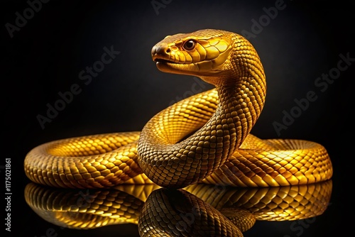 © Arnada, Fototapeta premium Golden Snake Statue, Coiled Serpent, Low Light, Isolated Background
