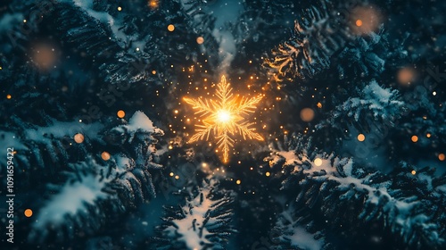 © Handz, Fototapeta premium Golden Snowflake Glowing In Snowy Pine Branches