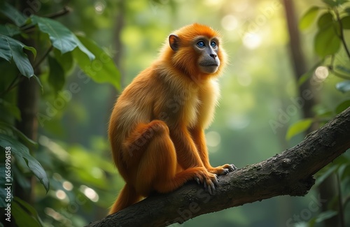 © Maryna, Fototapeta premium Golden snub-nosed monkey perches on tree branch in forest. Orange primate with blue eyes sits amongst green foliage. Wildlife species in natural habitat, conservation importance for biodiversity.