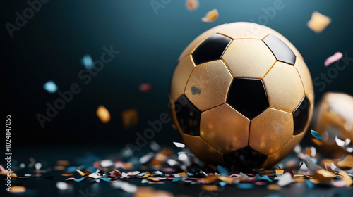 Fototapeta premium Golden soccer ball surrounded by colorful confetti on a dark background,...