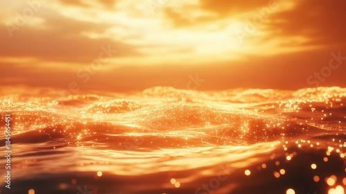 Fototapeta premium Golden sparkling particles illuminate a subtly undulating abstract digital ocean surface under a warm, diffused sky, creating a concept of connection, data flow, or energy in motion
