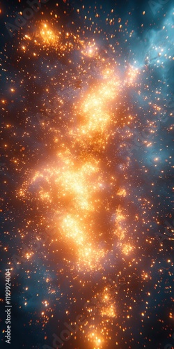 Fototapeta premium Golden sparks and particles flow and swirl against a dark teal and orange bokeh background. Use this abstract design for cosmic or fantasy-themed projects.