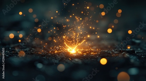 © Biancaart, Naklejka premium Golden Sparks Erupting on Dark Surface with Bokeh Light Effect