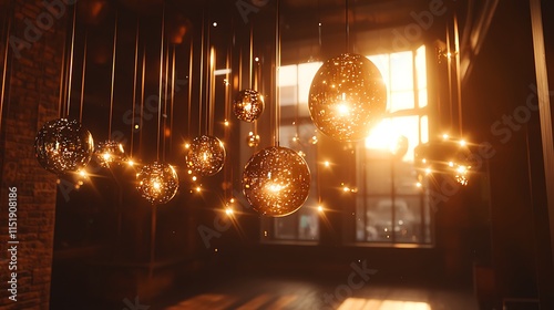Obraz premium Golden Sphere Lights Hanging in Loft Interior