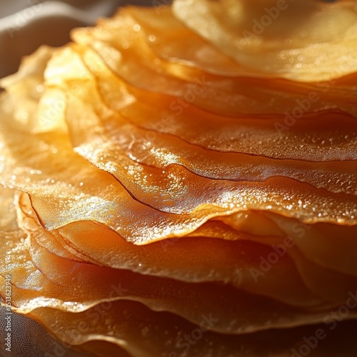 © Asad, Obraz premium Golden Stack: Close-up of Delicious Homemade Crepes, a Culinary Delight for Breakfast or Dessert, Showcasing Textural Perfection and Warm, Inviting Tones