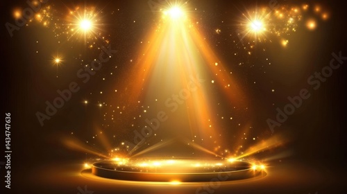 © Agri, Naklejka premium Golden stage spotlights illuminate a circular platform.