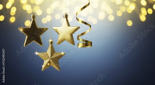 © Dari, Fototapeta premium Golden star ornaments and glittering ribbon with sparkling bokeh lights on blue background