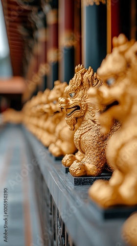 Fototapeta premium Golden statues of mythical creatures in an ancient temple, golden statues, mythical luxury