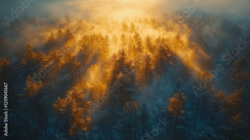 © hocine, Fototapeta premium Golden Sun Rays Break Through Misty Forest Canopy at Dawn, Illuminating Frosted Trees in a Serene Winter Landscape