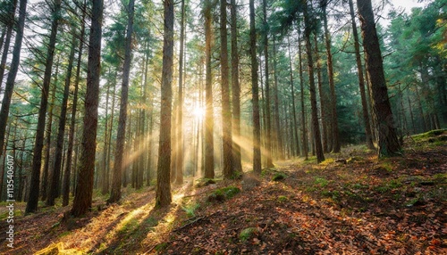 Obraz premium Golden Sun Rays Breaking Through Dense Pine Forest on a Crisp Autumn Morning