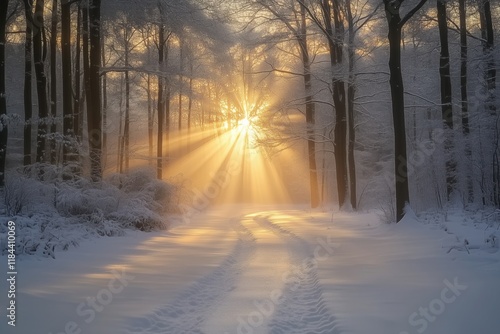 Naklejka premium Golden sun rays illuminating a snowy forest road at dawn, creating a magical...