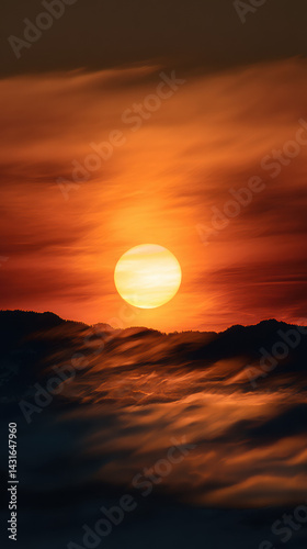Fototapeta premium Golden sun rises over the misty mountains, casting an ethereal glow on the swirling fog, painting the sky with vibrant hues of orange and red at dawn's early light.