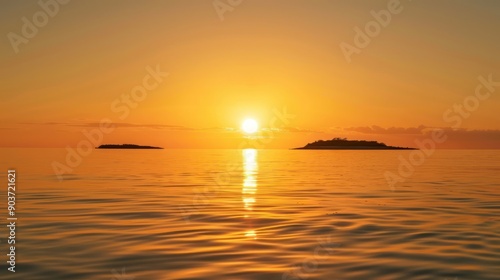 Obraz premium Golden sun setting behind distant islands and calm waters