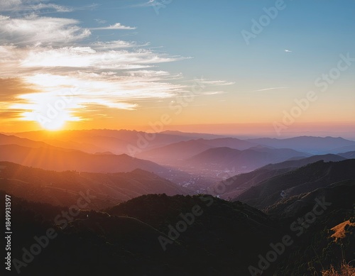 © Budi, Fototapeta premium Golden Sun Setting Over Misty Mountain Range With Hazy Horizon And Distant Town Lights
