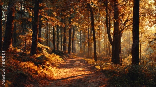 Fototapeta premium Golden sunbeams illuminate a serene autumn forest path, bathed in warm light...