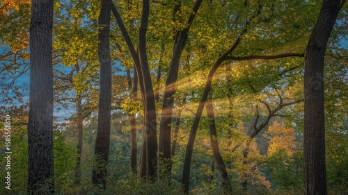 © Sk siam, Obraz premium Golden sunbeams illuminate a tranquil forest scene in autumn