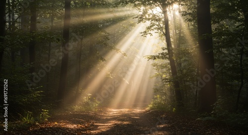 Obraz premium Golden sunbeams illuminating a pathway in a lush green forest.